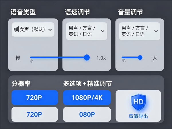 | 4. 设置语音,调整参数 | 5. 一键合成,快速导出 |