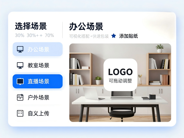 选择数字人形象(支持克隆分身),搭配直播场景,添加LOGO、产品海报等元素。